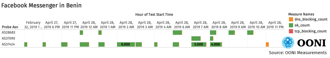 The following chart, based on OONI data collected from Benin, illustrates the blocking of social media sites on 28th April 2019, amid Benin’s 2019 parliamentary elections.