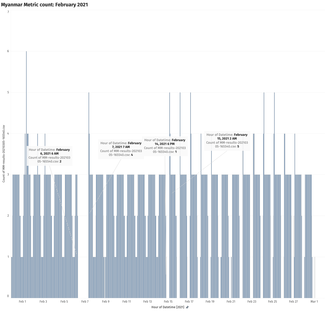 As we can see from the above chart, starting from 6th February 2021 at 06:00 UTC until 7th February 2021 at 07:00 UTC, there is a complete absence of data points, strongly suggesting that an Internet connectivity shutdown event occurred. Compared to the first Internet outage on 1st February 2021 (during which some network connectivity was still present), this second outage (on 6th February 2021) was much more severe and pervasive, as no Mozilla telemetry clients were able to report back any data.