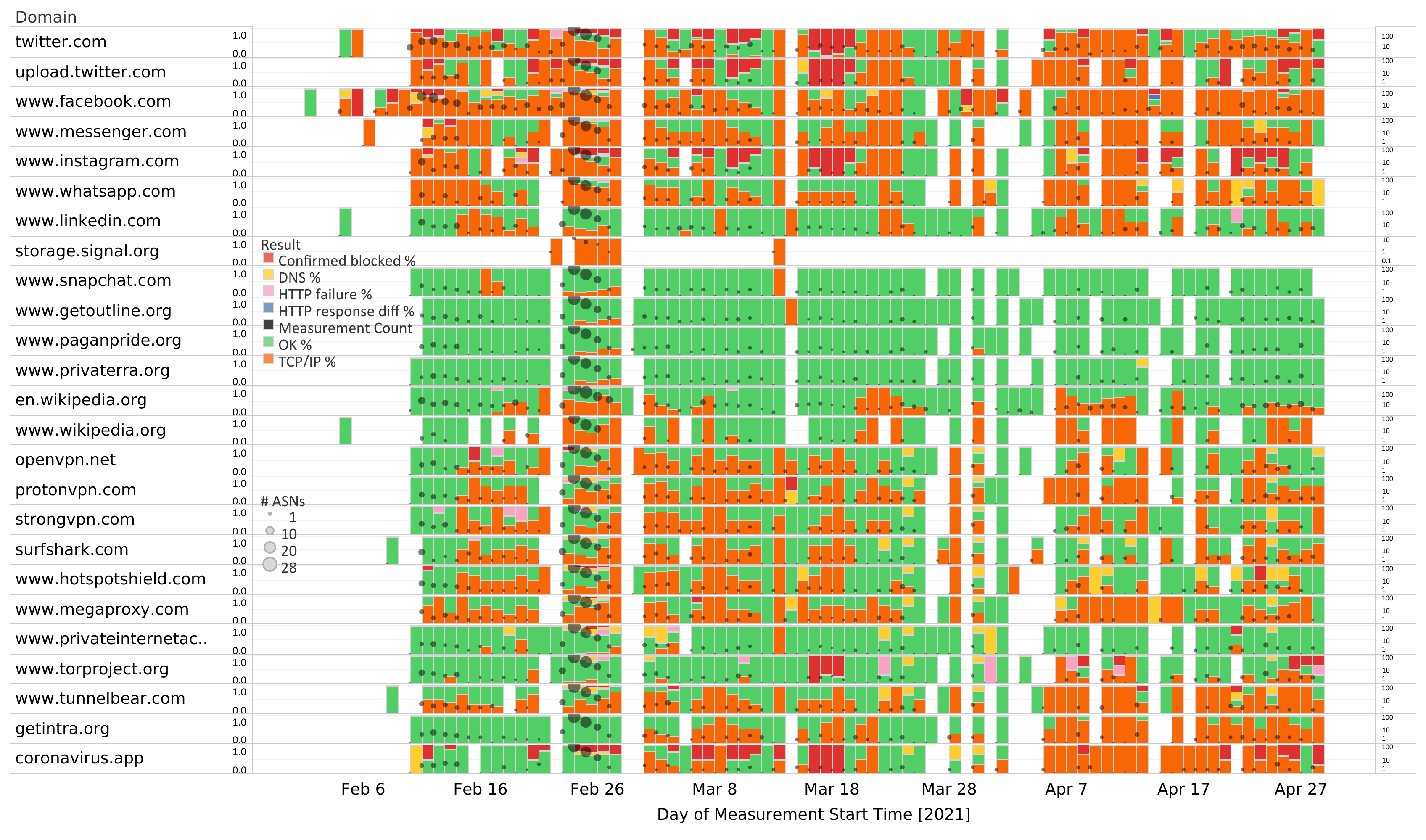 Source: Blocking of websites in Myanmar from February 2021 to April 2021 based on OONI measurements.
