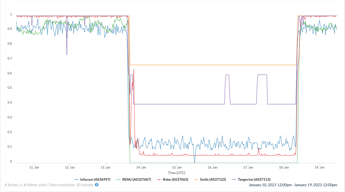 The above graph shows IODA’s active probing signal for five major networks in Uganda; we see that the outage began at around 16:00 UTC on 13th January 2021 and ended at around 09:30 UTC on 18th January 2021 for all these networks. This level of coordination in timings suggests that network operators were able to anticipate and execute the enforcement and the relaxation of the shutdown according to pre-planned schedules.