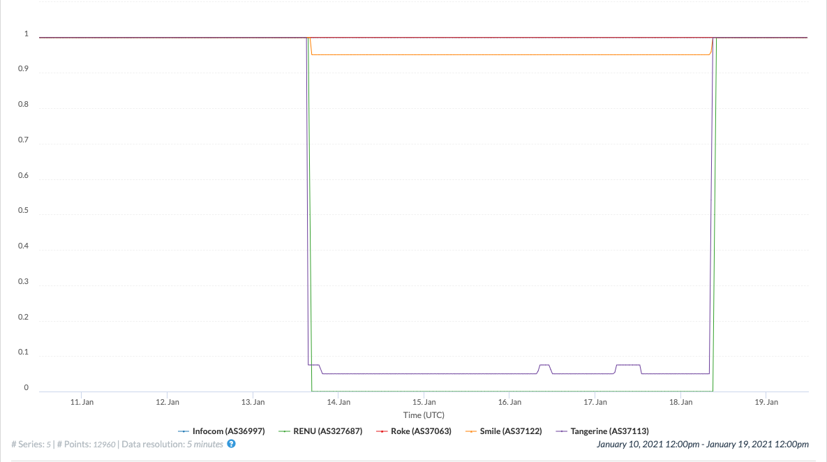 The graph above shows IODA’s BGP signals for the five networks from the previous graph that had similar outage timing patterns. We see that only some of these networks’ outages are visible in the BGP signal although each had a noticeable drop in the active probing signal. There is a large drop in BGP-visible /24 blocks for RENU (AS327687) and Tangerine (AS37113) and a smaller but discernible drop for Smile (AS37122). However, Infocom (AS36997) and Roke (AS37063) do not see any drop in BGP-visible /24 blocks during this period. These dissimilarities in the outage’s signature in IODA’s signals may reflect the use of different approaches by these networks’ operators for disconnecting their networks.