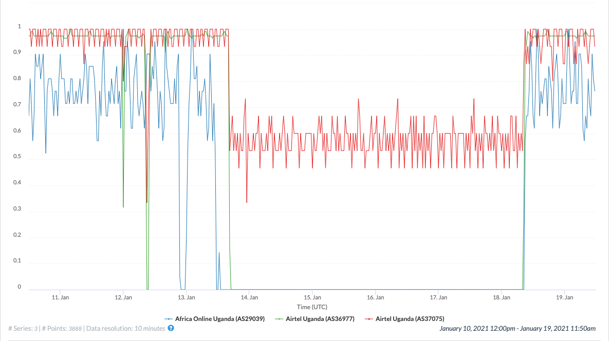 Some networks appeared to experience brief but major outages even before the multi-day outage that began on 13th January 2021. Two ASNs operated by Airtel Uganda (AS36977 and AS37075) experienced a brief outage on 12th January 2021 at around 00:30 AM UTC and another short outage on 12th January 2021 at around 09:00 AM UTC. Africa Online Uganda (AS29039) experienced an outage on 12th January 2021 at around 22:00. These outages could perhaps be due to potential tests that network operators may have performed in anticipation of the government order to suspend internet connectivity.