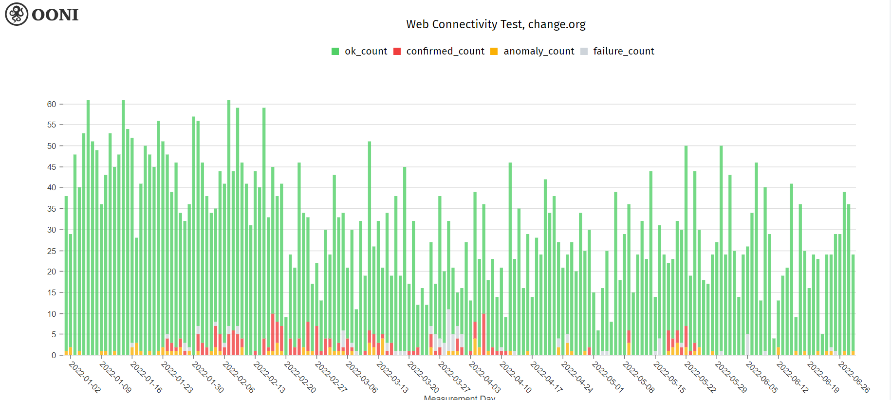 Network measurements are gathered through the use of OONI Probe app, a free software tool developed by Open Observatory of Network Interference (OONI). To learn more about how the OONI Probe test works, please visit https://ooni.org/nettest/.