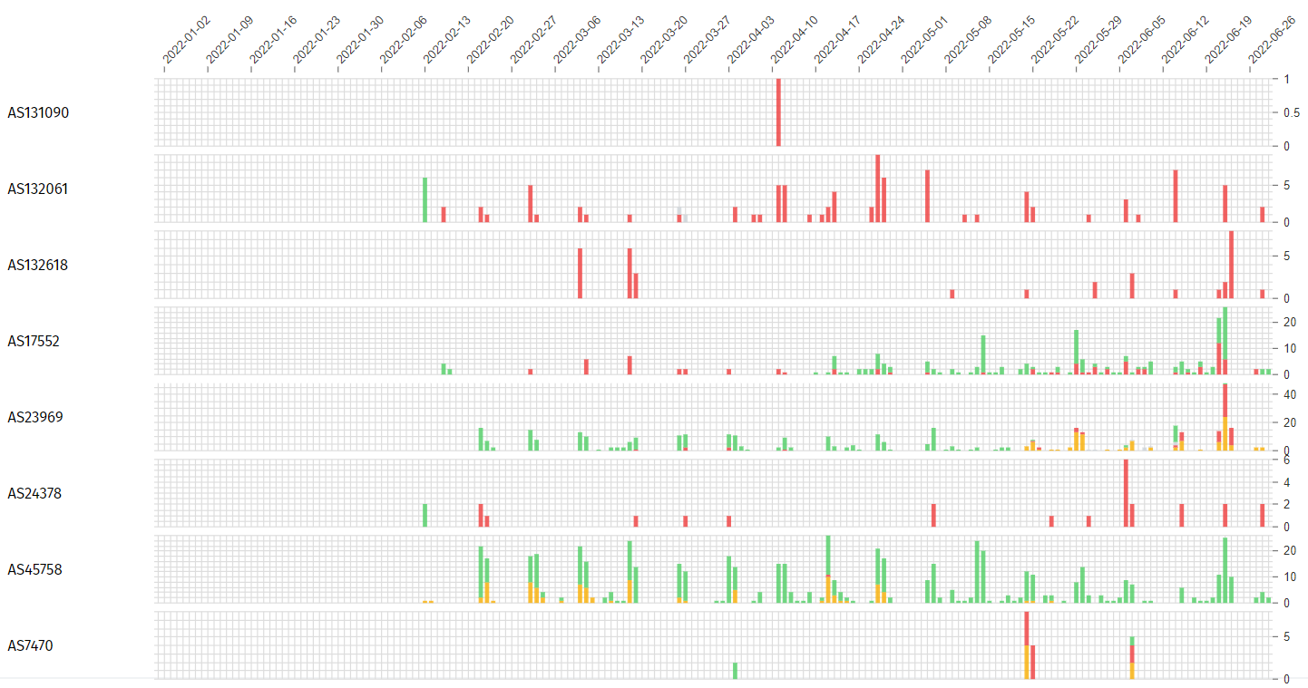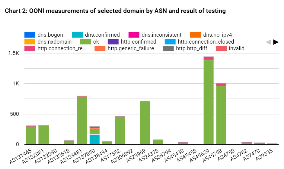 In the six-month period, 3,129,067 measurements were recorded in OONI’s testing for web connectivity from 30 vantage points. From this total, it was found that 95.8% (2,996,695) were OK, 3.1% (96,626) were anomalies, 0.3% (8,982) were confirmed blockings and 0.9% (26,664) were failed measurements. Furthermore, 5 ASNs made up about 80% of the total measurements equivalent to 2.5 million measurements: JasTel Network International Gateway (29%), TripleT (16%), SBN-IIG (14%), TOT Public Company Limited (13%) and TRUE Internet Co. Ltd.