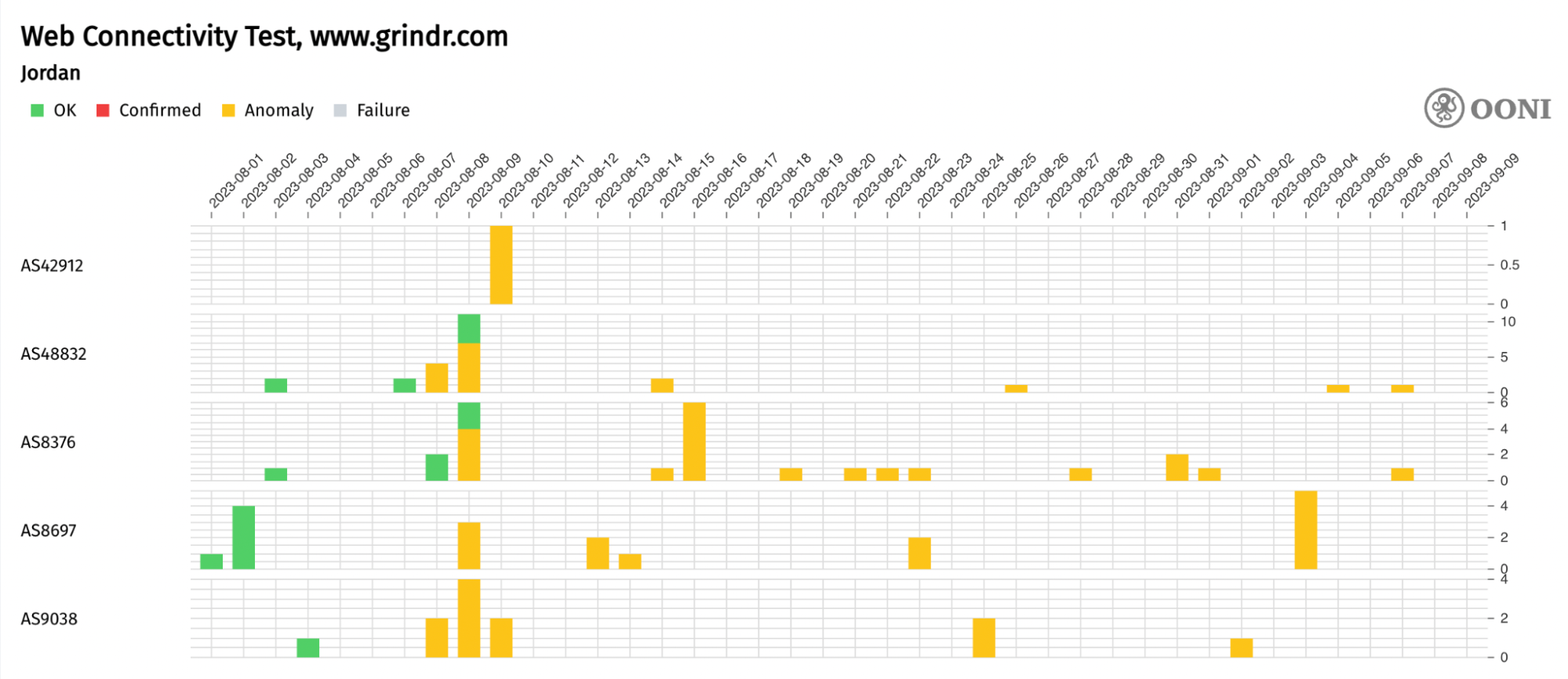 Chart: OONI Probe testing of Grindr’s website (www.grindr.com) on 5 networks in Jordan between 1st August 2023 to 9th September 2023 (source: OONI MAT).