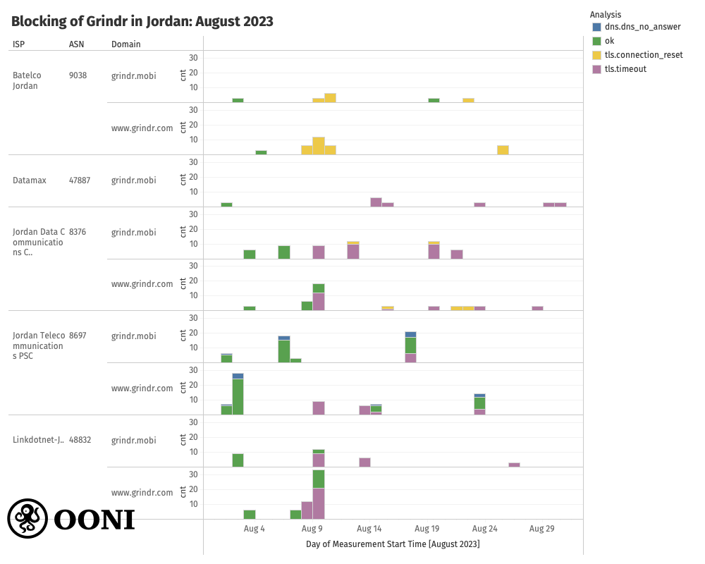 On 10th August 2023, community members from Jordan alerted OONI that Grindr was blocked in the country. To investigate the reported blocking of Grindr, we analyzed OONI measurements collected from the testing of Grindr’s website (www.grindr.com) and endpoints (required for the functionality of the Grindr app) in Jordan throughout August 2023. The main question we attempted to answer was whether OONI data provides signals of Grindr blocking in Jordan during the reported dates. We also aimed to examine whether we see signals of Grindr blocking on different networks in Jordan, and to characterize the potential blocks (i.e. determine the censorship techniques) on each network.