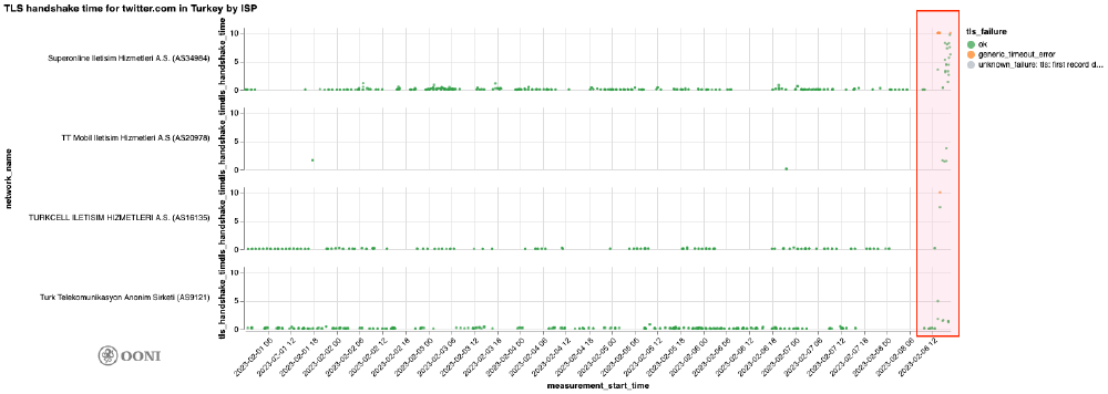 We can see that while the TLS handshake time for Twitter IPs was previously ~100ms on Turkcell Superonline (AS34984), it significantly increased to more than 3 seconds after 15:00 UTC on 8th February 2023.