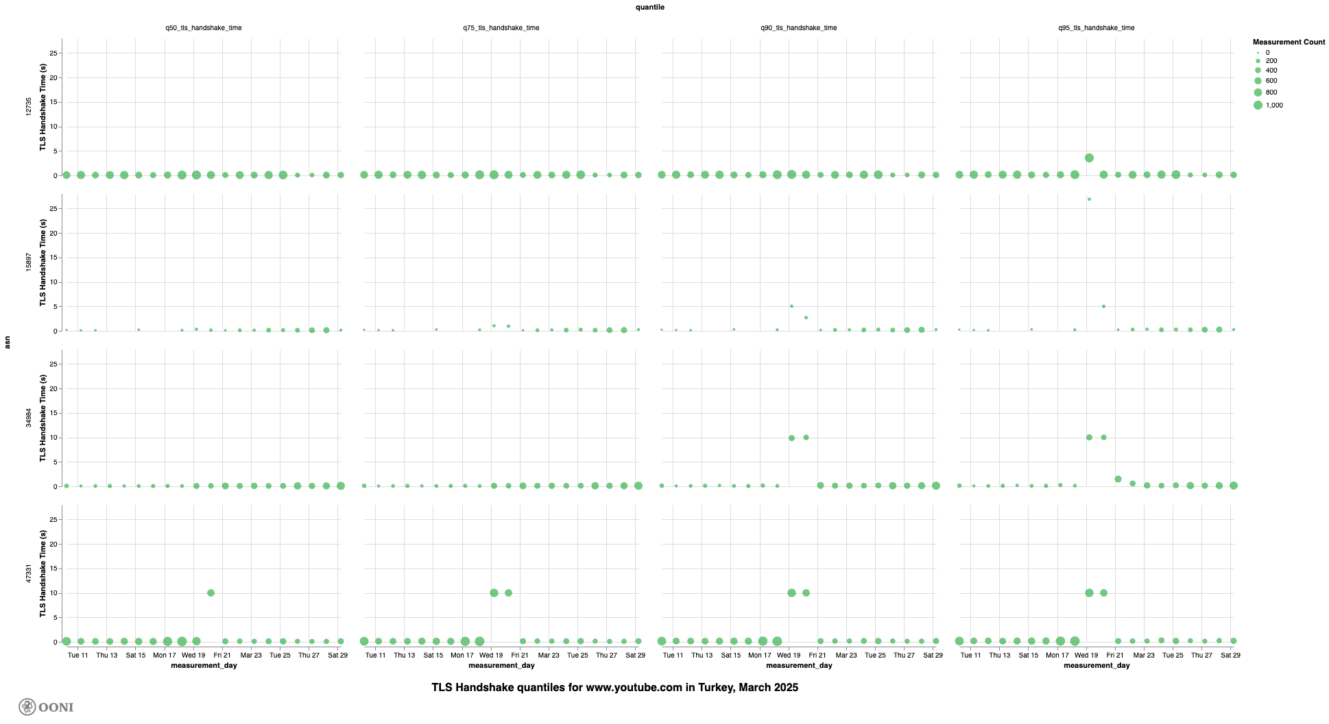 TTNET A.Ş., the owner of AS47331 network, is part of the Türk Telekom Group, and is the largest Internet Service Provider (ISP) in Türkiye. When we focus on TTNET (AS47331), we can see that the data shows a strong indication of throttling on 19th and 20th March 2025. The quantiles are unusually high during those days, implying that the TLS handshake time was unusually high (demonstrated below).