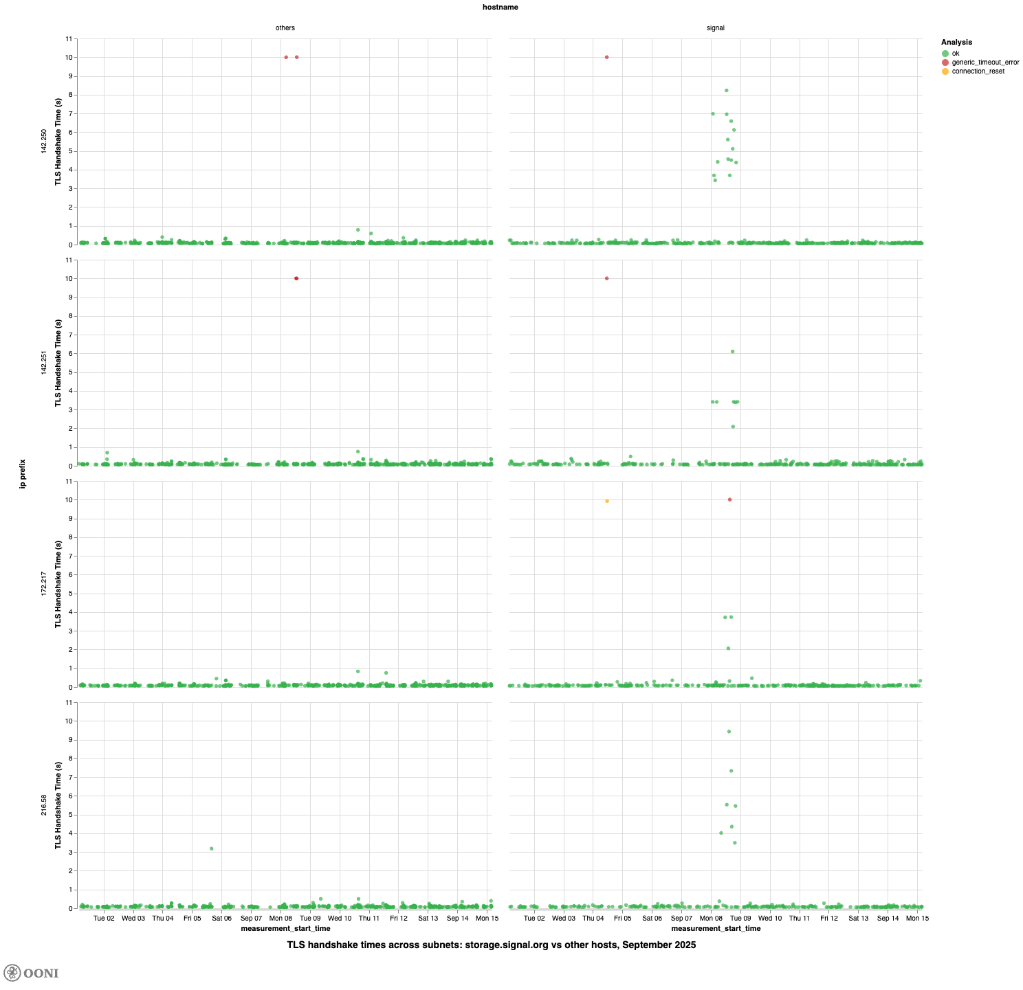 Chart: TLS handshake times for storage.signal.org on major IP prefixes in Türkiye from 1st to 15th September 2025 (source: OONI data).