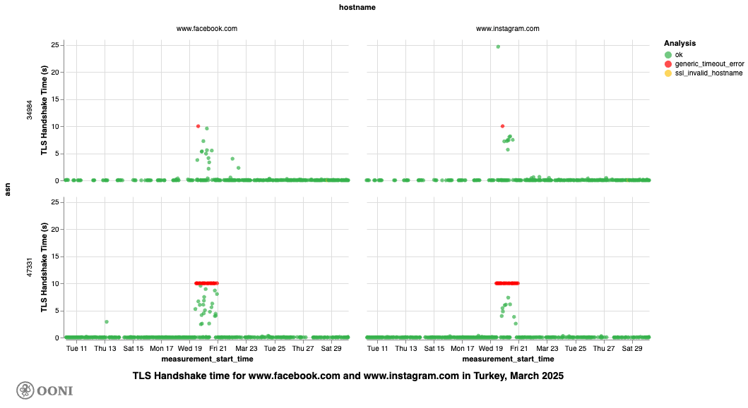 In this report, we present OONI data and findings from our investigation into the throttling of social media platforms across various networks in Türkiye during March and September 2025, periods when interference with these platforms was reported. Specifically, OONI data suggests that access to Twitter/X, Facebook, Instagram, WhatsApp, YouTube, TikTok, and Signal was throttled, whereas access to Telegram was blocked. Additionally, YouTube was blocked via DNS on TurkNet (AS12735). Details are shared below.