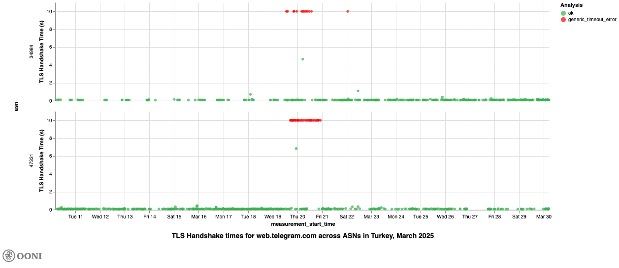 We observed the exact same pattern on 8th September 2025, when the OONI Probe testing of web.telegram.org resulted in TLS handshake timeout errors on TTNET (AS47331) and Turkcell Superonline (AS34984), suggesting that access to Telegram Web was blocked on those networks on that day.