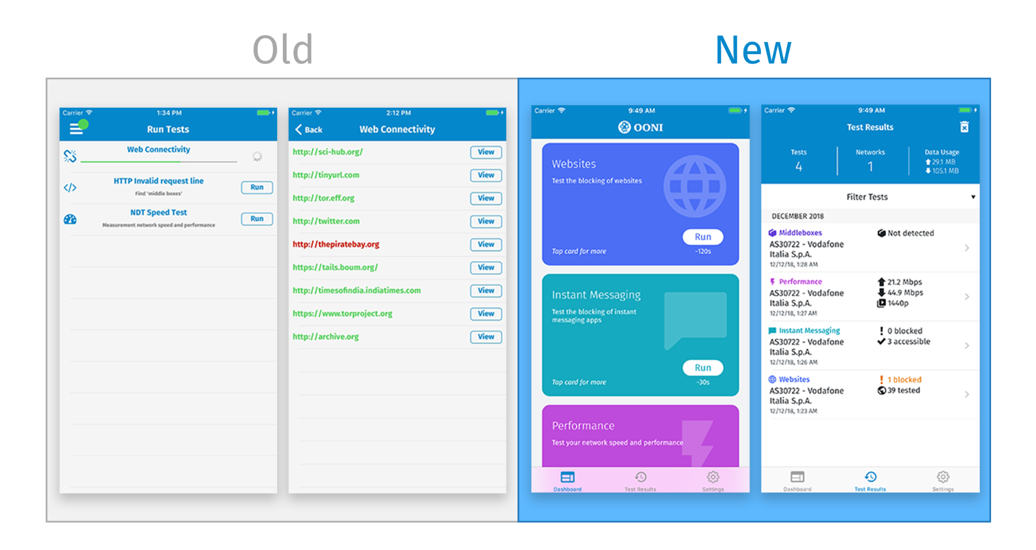 Image: Comparison of OONI Probe Mobile 1.0 (old) with OONI Probe Mobile 2.0 (new).