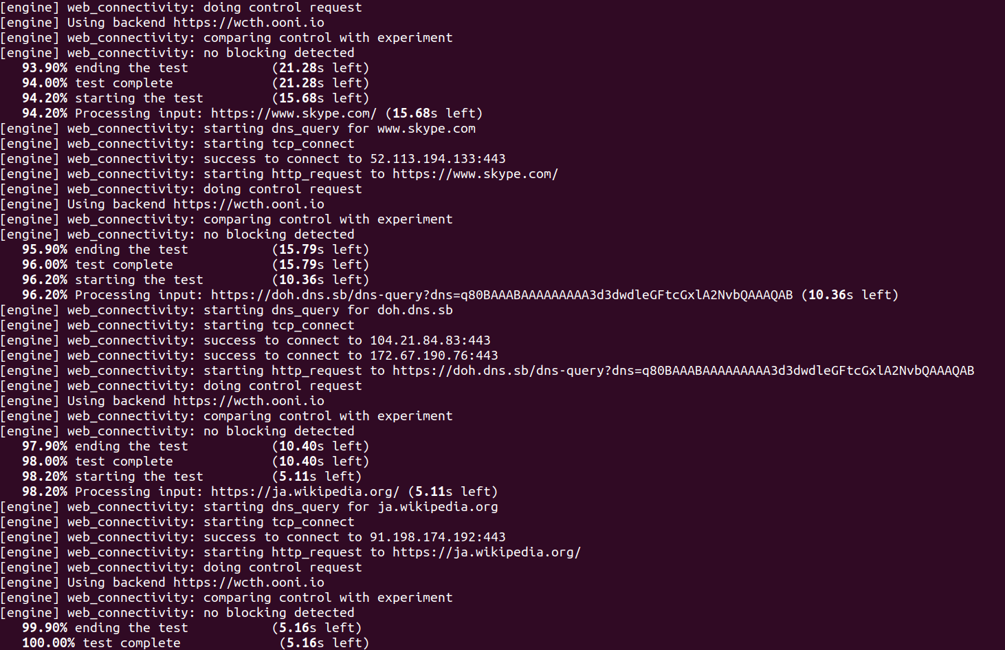 The above experiments have been integrated into our OONI Probe app, enabling users to run these tests on networks worldwide. We also integrated the NDT and DASH performance tests, developed by, and in collaboration with, the Nexa Center for Internet and Society and Measurement Lab (M-Lab). To encourage community members to contribute their own experiments to OONI Probe, we published a tutorial explaining how to write OONI Probe tests.