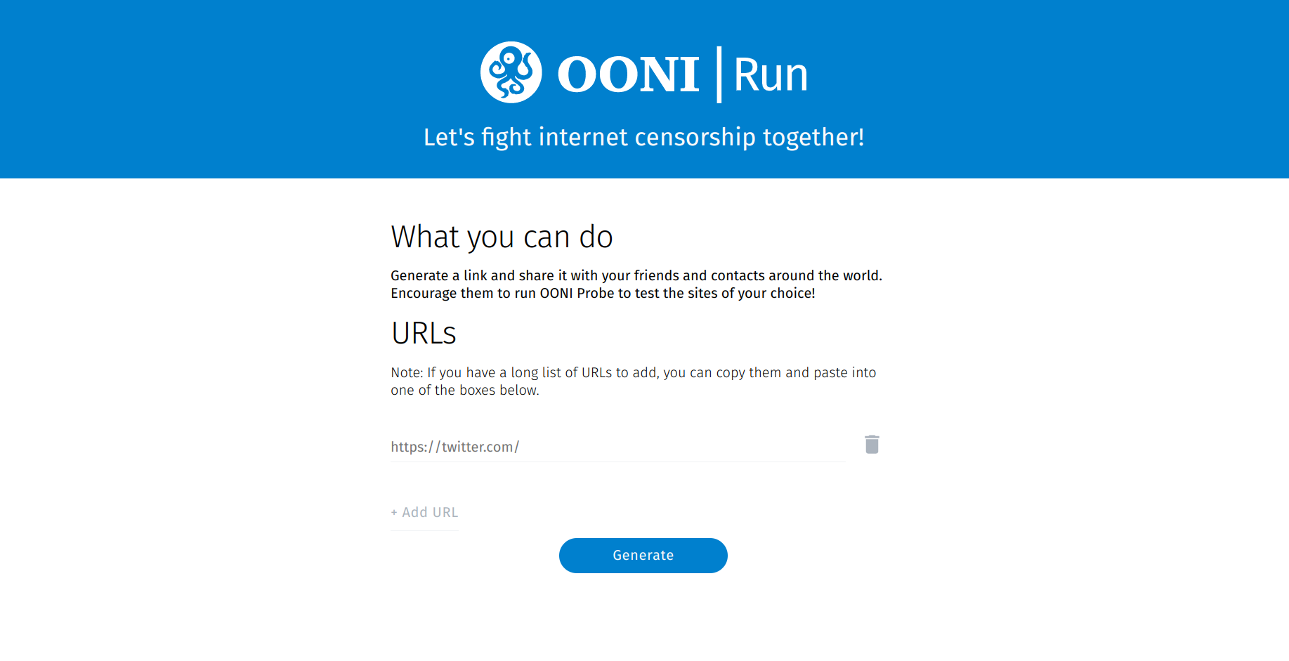 To support community efforts aimed at coordinating censorship testing, we launched OONI Run in September 2017. OONI Run is a platform that you can use to generate mobile deep links and widget code to coordinate OONI Probe testing. Initially, OONI Run supported multiple OONI Probe tests, but based on community feedback, we limited the platform to website testing and made other improvements.