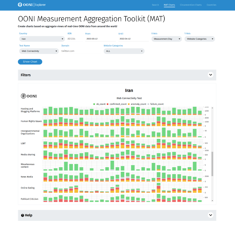 To identify censorship trends and patterns, it is necessary to look at many measurements at once (in aggregate). To this end, we launched the OONI Measurement Aggregation Toolkit (MAT) in April 2022, which enables you to track internet censorship worldwide in real-time and create charts based on aggregate views of OONI data.