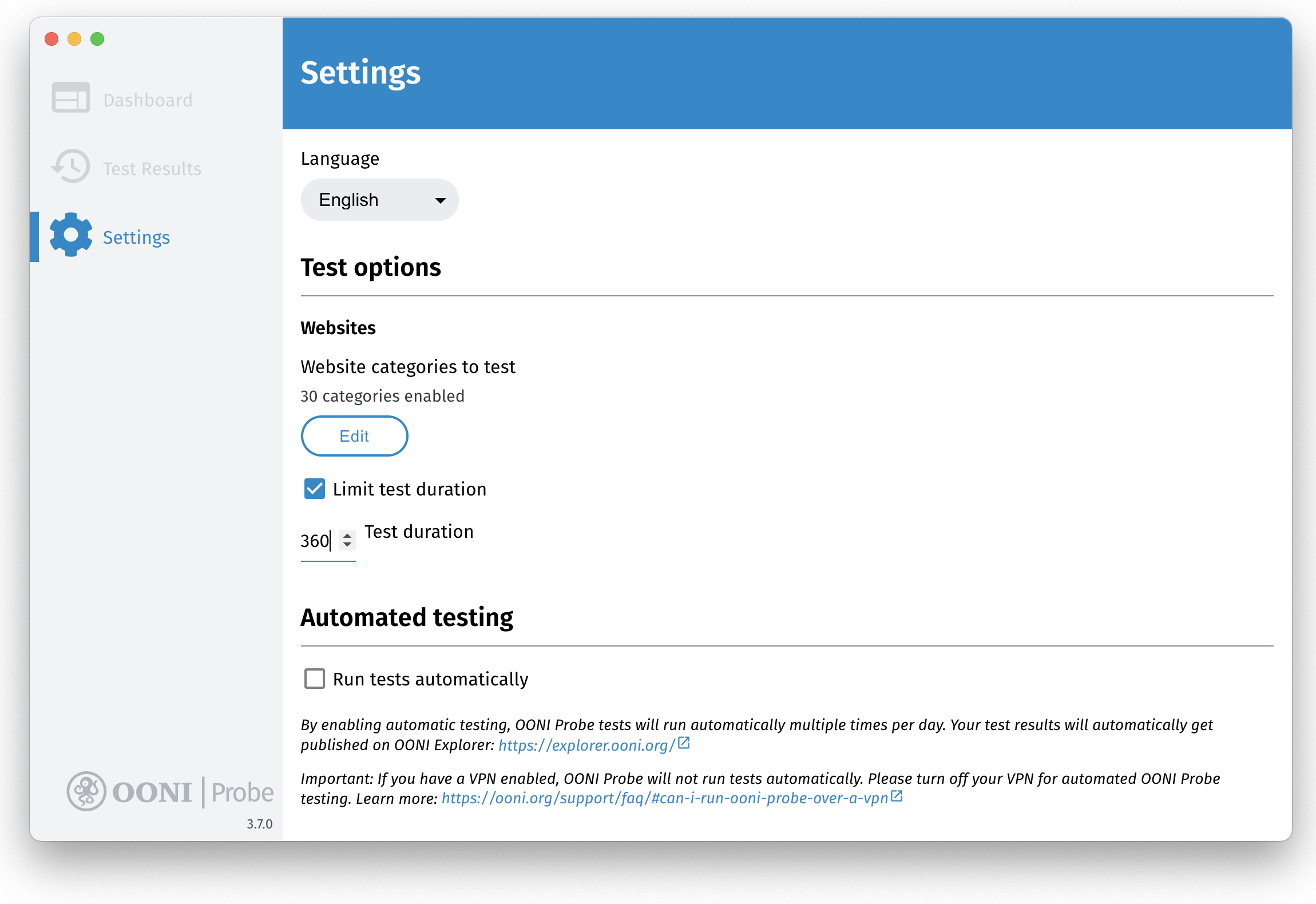 The automated OONI Probe testing settings have already been covered in previous sections of this guide. Please refer to the “Automated OONI Probe testing” section.