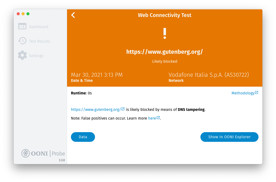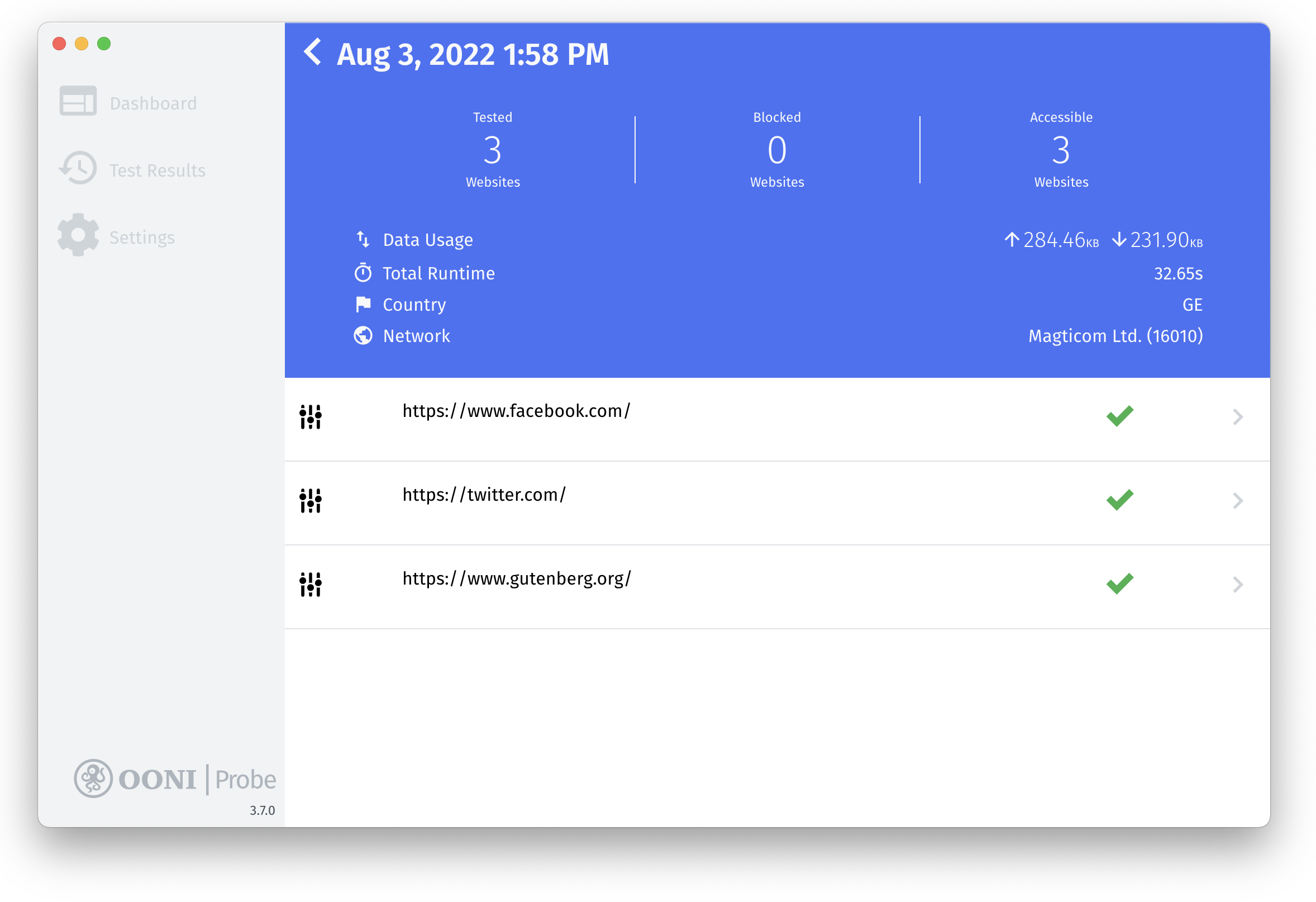 Your OONI Probe test results will automatically get published on OONI Explorer and on the OONI API.