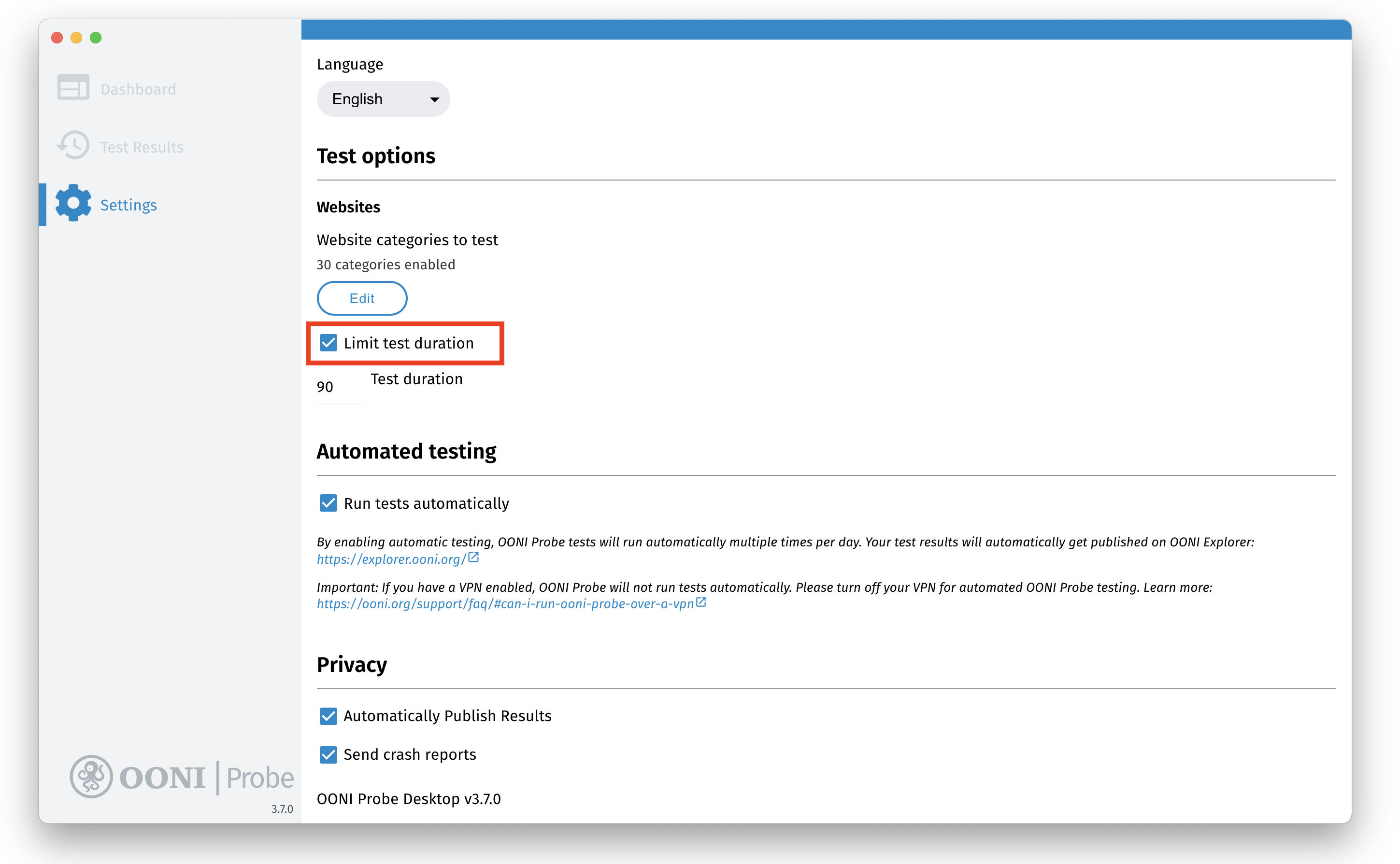 Detailed information about OONI Probe settings can be found in the Configuring your OONI Probe settings section of this guide.