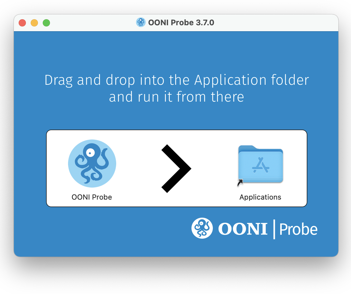 On macOS, drag and drop the OONI Probe icon into the Application folder.