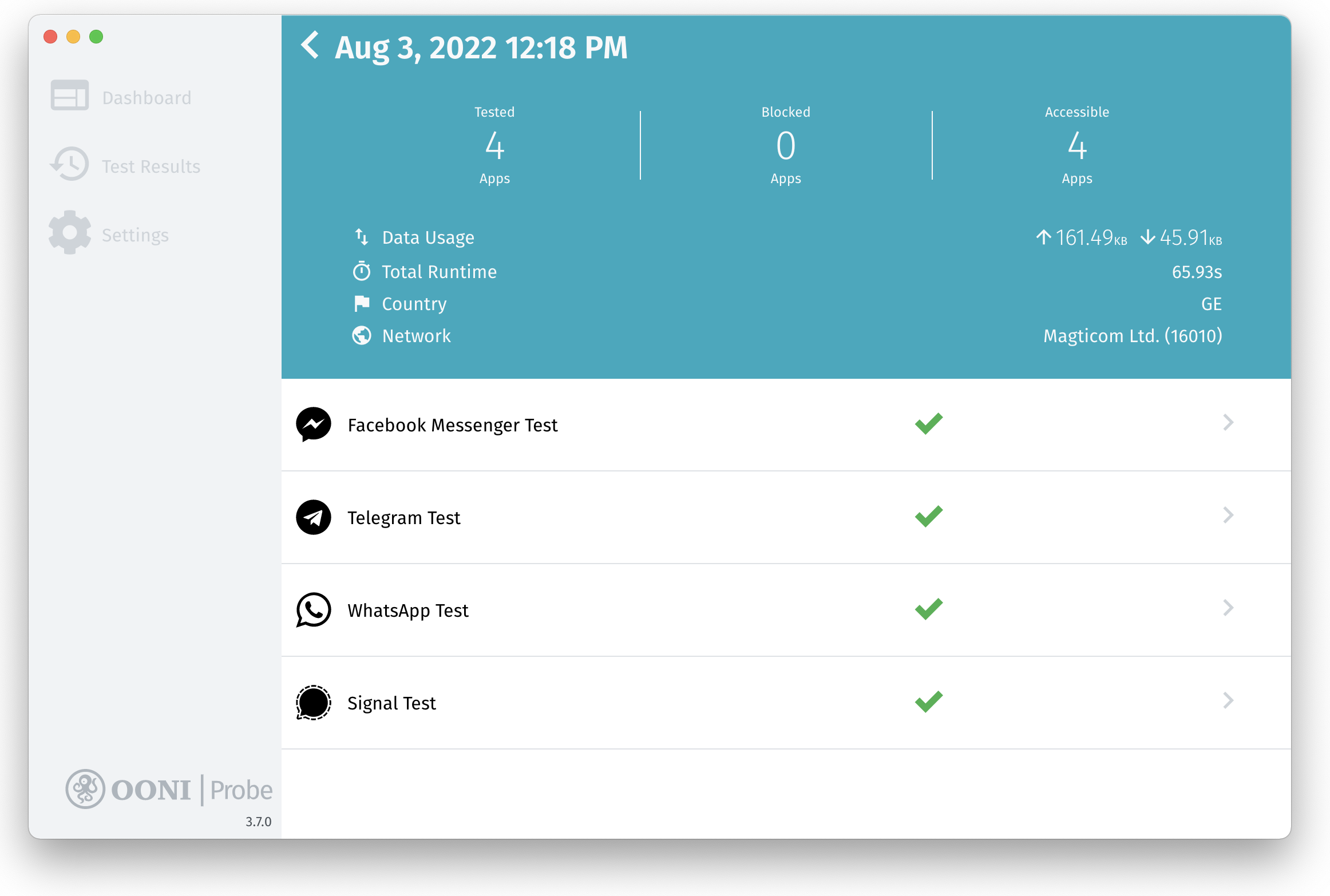 Similarly, you can access Telegram test results through the instant messaging results in your OONI Probe app.